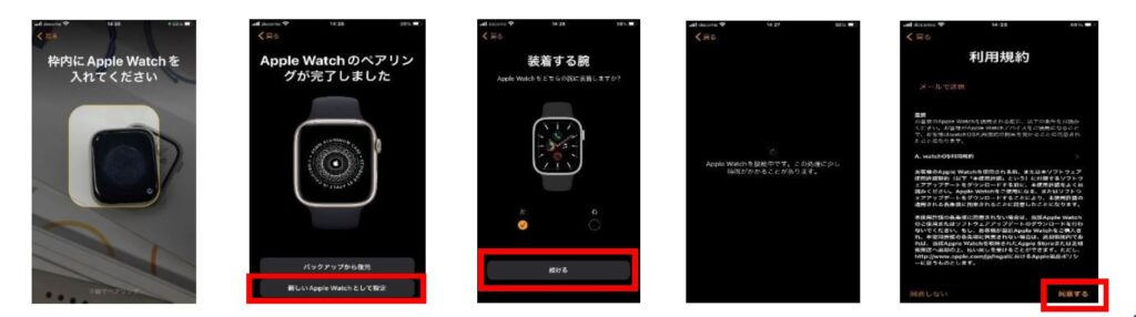 3.アプリ「枠内にApple Watchを入れてください」と表示されたら、画面を見ながらApple Watchを入れる。ペアリングが完了したら「新しいApple Watchとして設定」をタップする。
