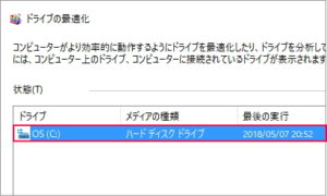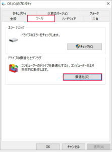 [テバイスとドライブ]欄の[OS(C)]上で右クリックします。※パソコンによってOS、Windowsなどと違いがあります。(Cドライブを確認する) [プロパティ]を選択します。 [OS(C)]の[プロパティ]が表示されます。 [ツール]タブをクリックします。 [ドライブの最適化とデフラグ]欄の[最適化]をクリックします。