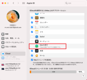 システム設定→iCloud、AppleIDなどをクリックし、概要を開き、Macを探すのチェックを外す