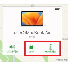 ロック:該当のMacをパスコードでロックしてしまう。パスコードで解除可能