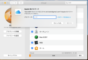 キャンセルを押すとAppleIDにログインの状態でMacを探すが前所有者によってロックされている状態