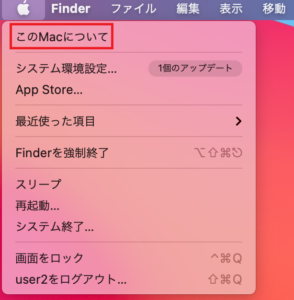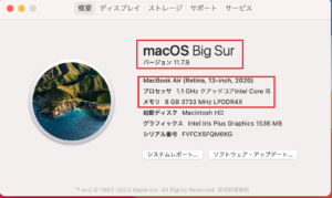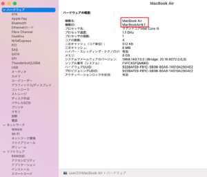 赤枠部分がOS、モデル(シリーズ)、CPU、メモリになります。