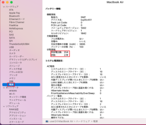 左側の電源をクリックし、充放電回数を確認(回数が少ない方が高い)